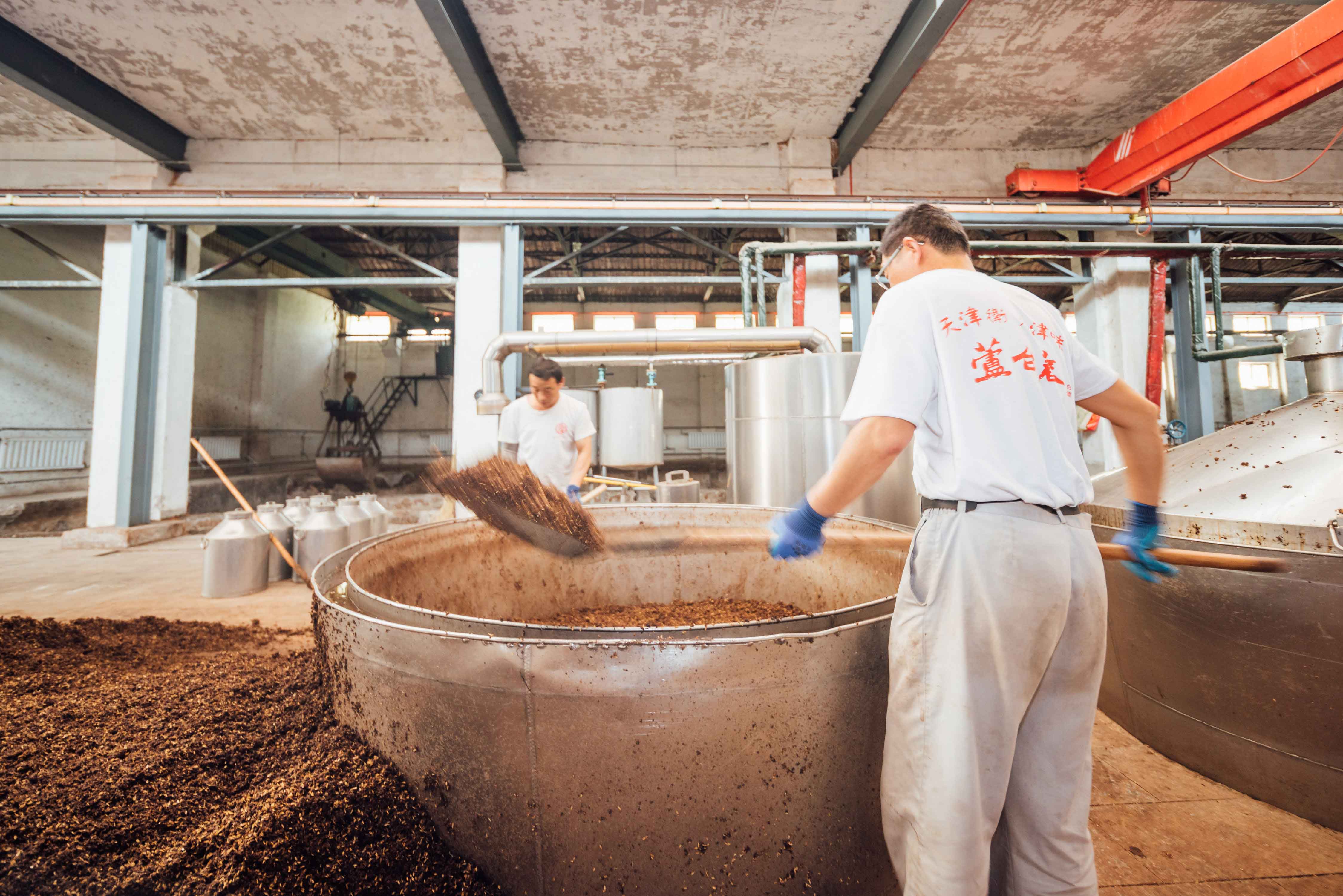 高粱是纯粮酿造的关键原料,精选优质的糯高粱再加上各种配置好的粮食谷物,就成为了酿造的基础。在这一年的酿造周期中要进行2次投粮,经过热水的炒制润粮。